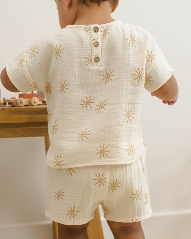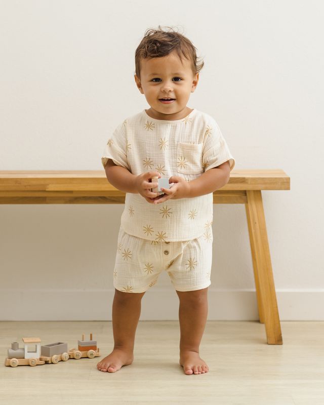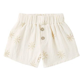 Woven short featuring an elastic waist and a mock fly with two buttons.