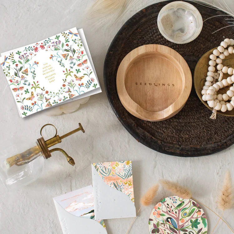 All Seedlings greeting cards have a PLANTABLE seed paper envelope which is embedded with wildflower seeds. This seed paper is made of a biodegradable eco-paper created with post-consumer materials - no trees harmed for this paper! When planted, our envelopes compost away leaving only flowers behind. Blank inside, our cards are printed on premium paper and are all accented with foil details.