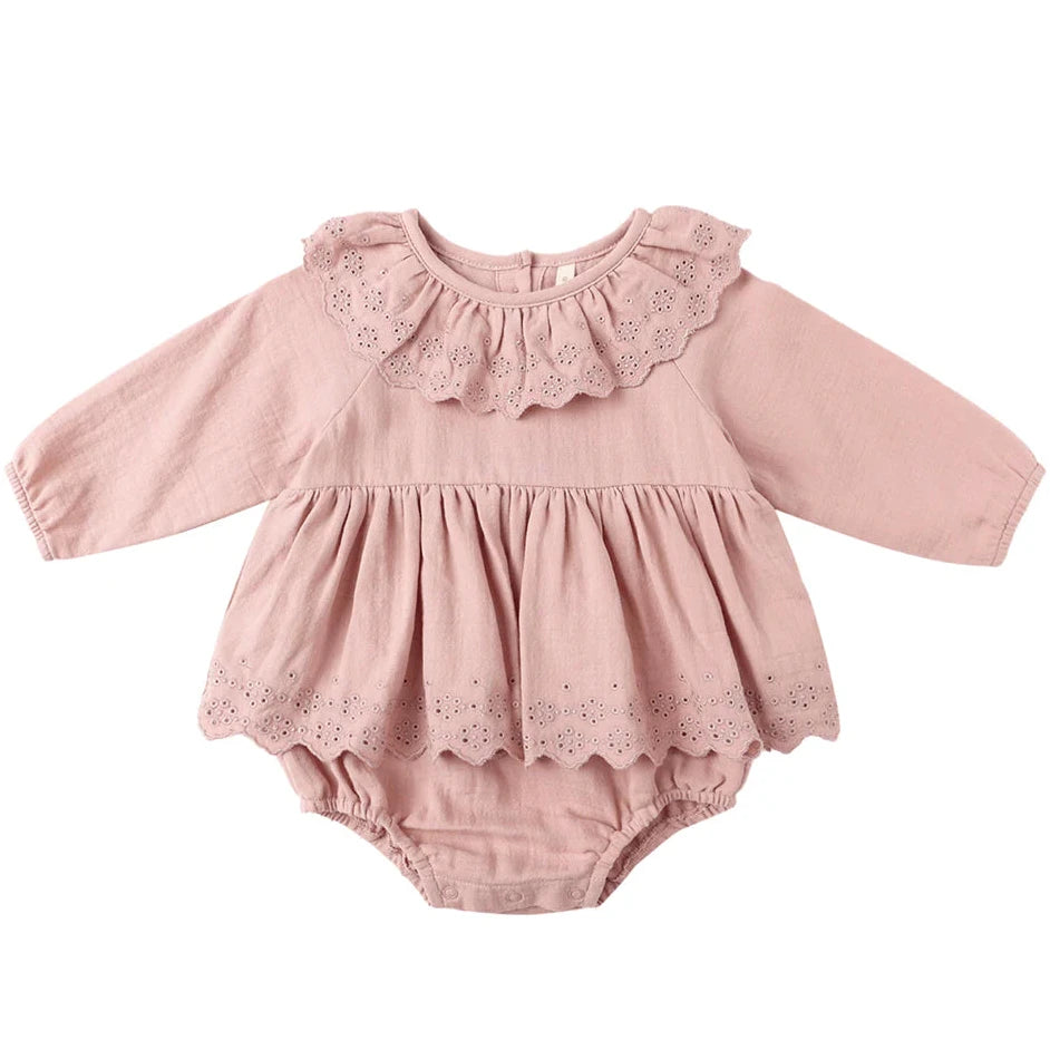 The Thalia Romper features a sweet collar, delicate lace trim, a gathered waist, coconut buttons down the back, and bottom snaps for easy changes.