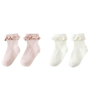 Set of 2 ultra-soft rib knit socks with lace trim.