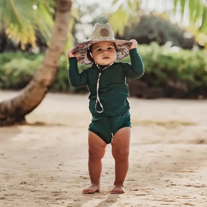 Get outside and adventure in our straw lifeguard hat for boys and girls. Woven of 100% natural straw fibers and featuring a large brim with UPF50+ material, our lifeguard hat offers optimum sun protection ensuring harsh UV rays are blocked from precious faces. Available in baby, toddler and youth sizing.