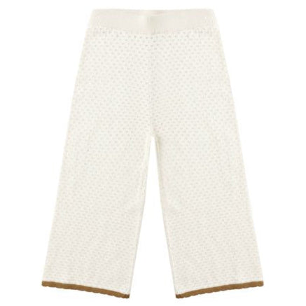 Our Pointelle Knit Pants feature a ribbed elastic waistband, contrast crochet lace hem, and a soft built-in liner for comfort. Pair with our Pointelle Collared Top for a sweet, coordinated look.