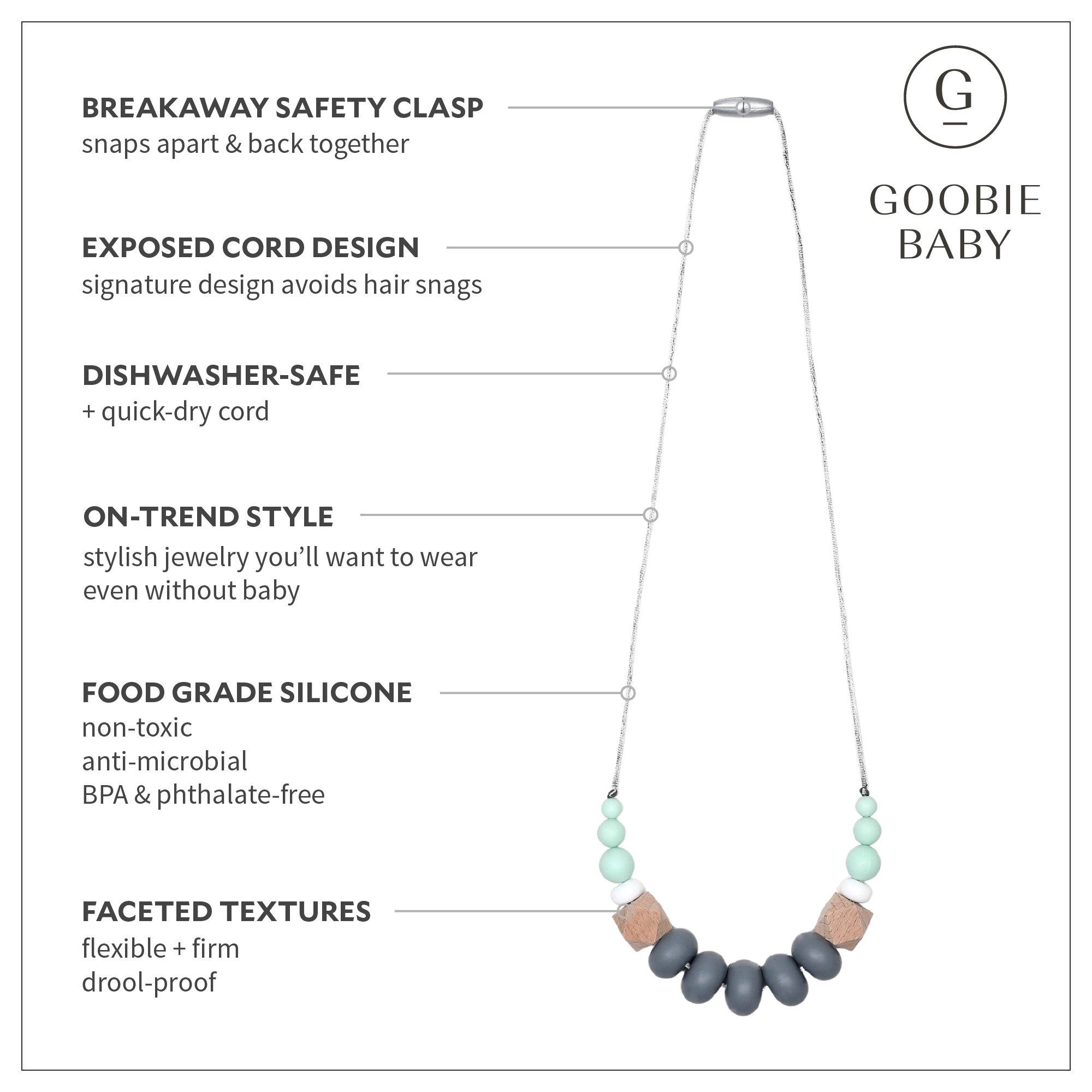 • sophisticated food grade silicone teething necklace, beautifully packaged and ready to gift.