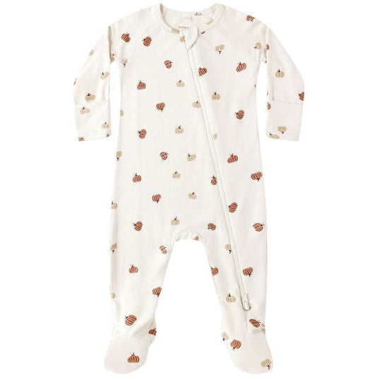 Full double-zip footie crafted from our soft and stretchy bamboo fabric. Fold-over hand mitts included on sizes NB – 3-6M. Raised screen print on soles of size 6-12M for added traction.