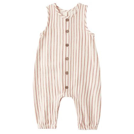 Sleeveless jumpsuit with coconut button front detail. Designed with elastic ankle openings for the perfect fit.