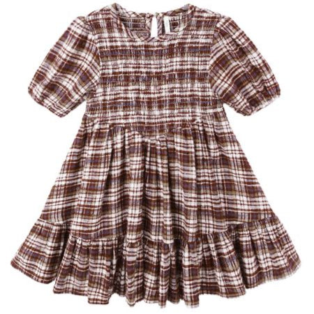 Our India Dress features a smocked bodice, a gathered V-waistline, and a flowing gathered bottom tier.