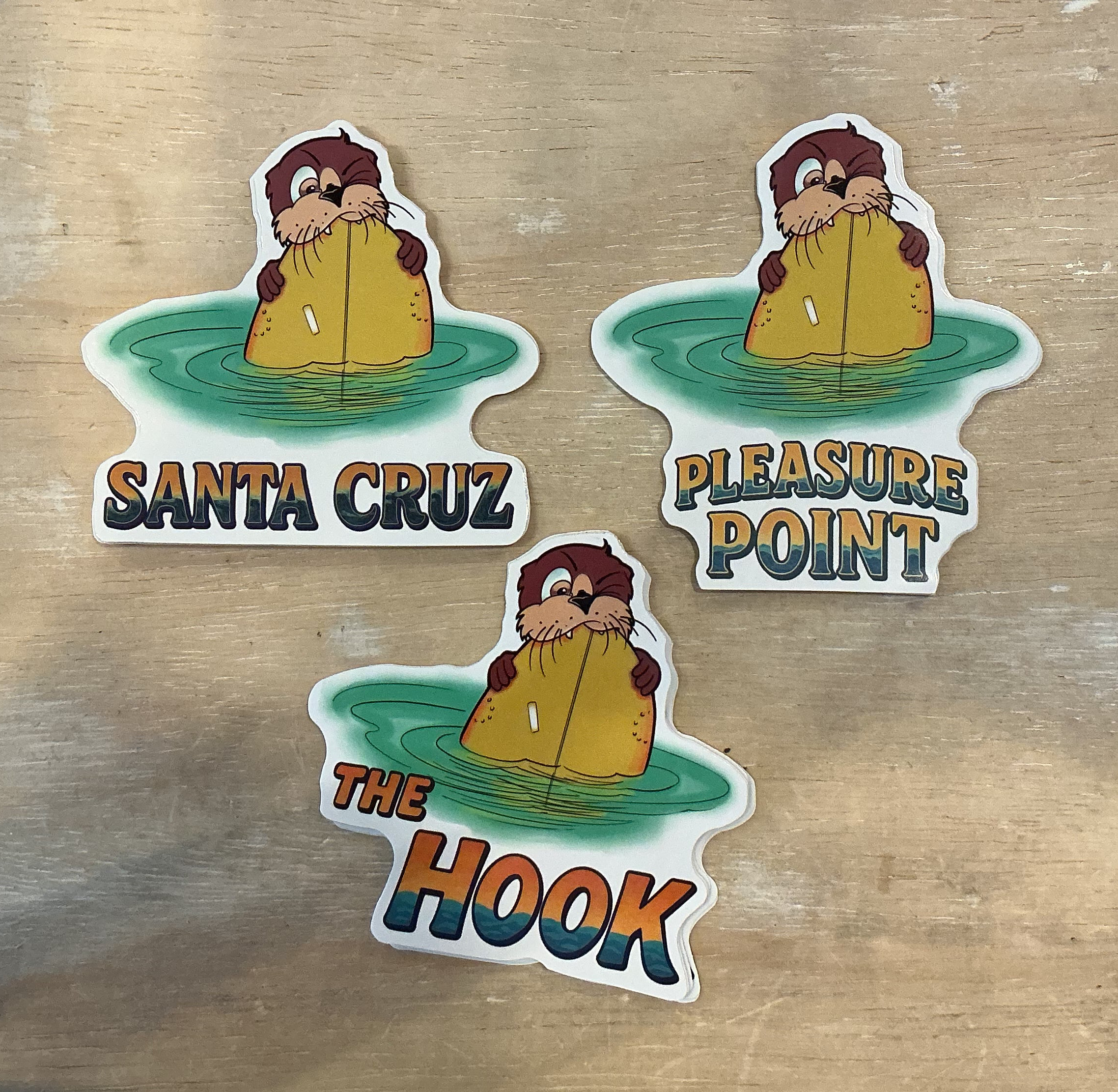 Options: Amelia Otter Santa Cruz sticker, Pleasure Point sticker, and the Hook sticker options.