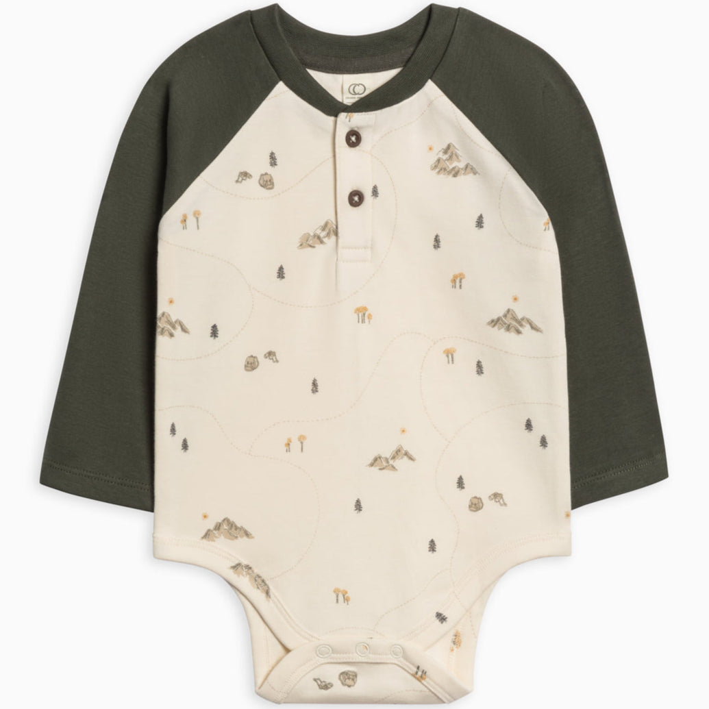 Long-sleeved body with hiking inspired print, and henley tee neckline.