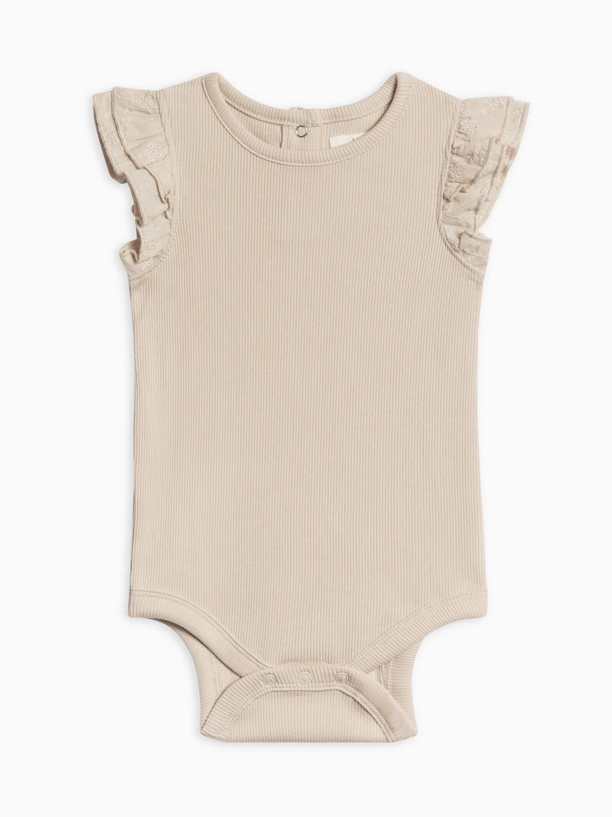 Maggie Ribbed Short Sleeve Bodysuit with Eyelet Ruffle - Oat