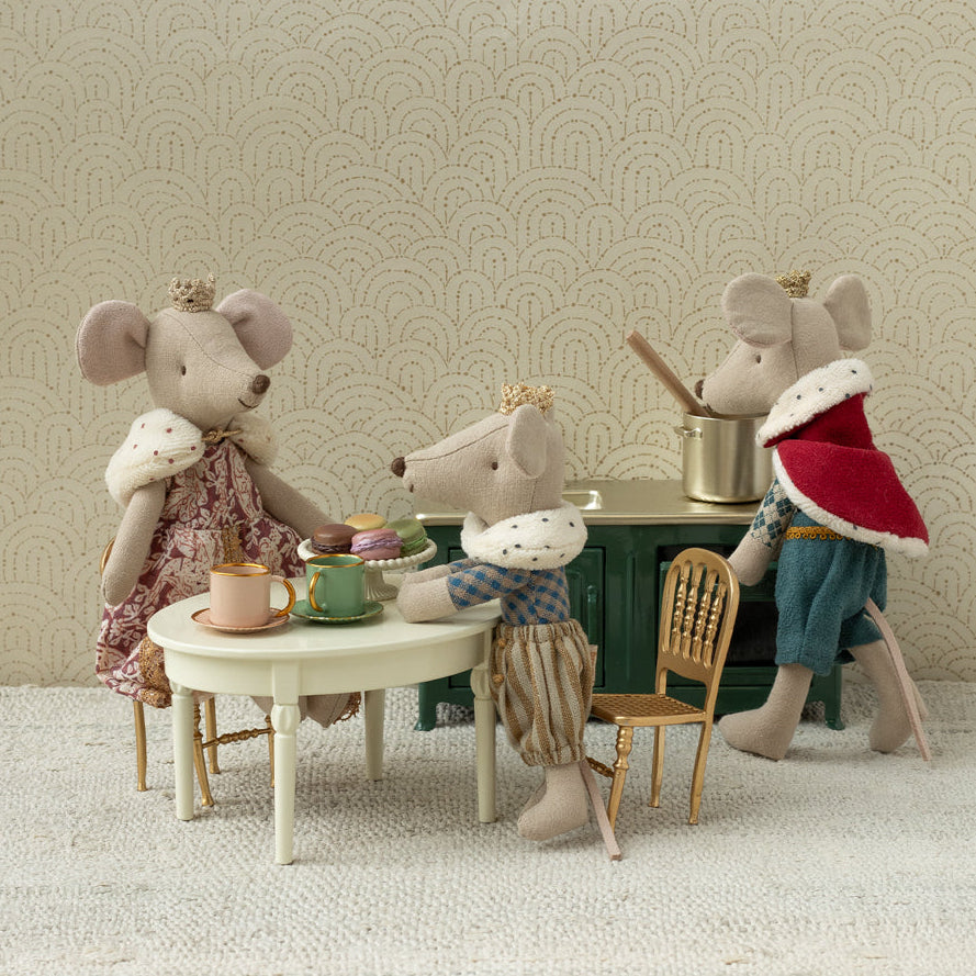 The dining table is made for the small friends to have a place to gather and meet for a nice meal. It is made of metal and has beautifully detailed legs that fulfill the exclusive look. The table fits into the Castle.