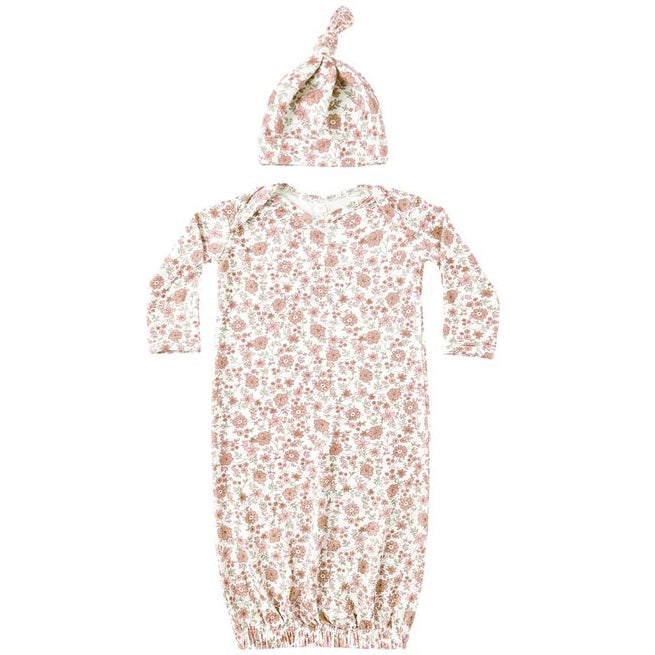 Crafted from our signature soft and stretchy bamboo fabric, this baby gown features an elastic bottom opening and fold-over hand mitts, paired with a coordinating knotted hat for cozy comfort.