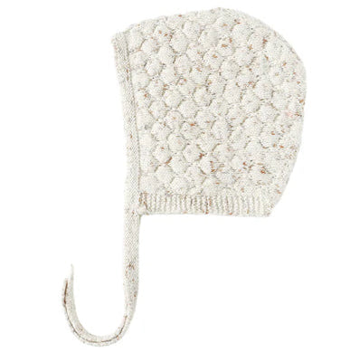 Bubble knit bonnet with classic chin ties—a charming accessory for cooler days.