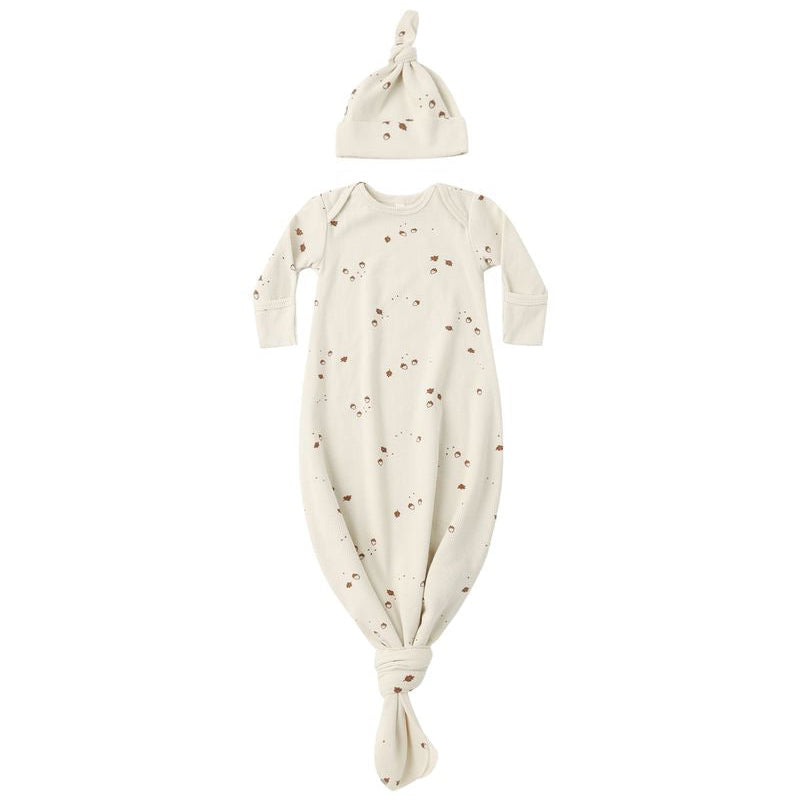Our knotted baby gown is designed with lap sleeves and fold-over hand mitts to keep baby snug, paired with a matching knotted hat—all crafted from our soft, stretchy rib knit.